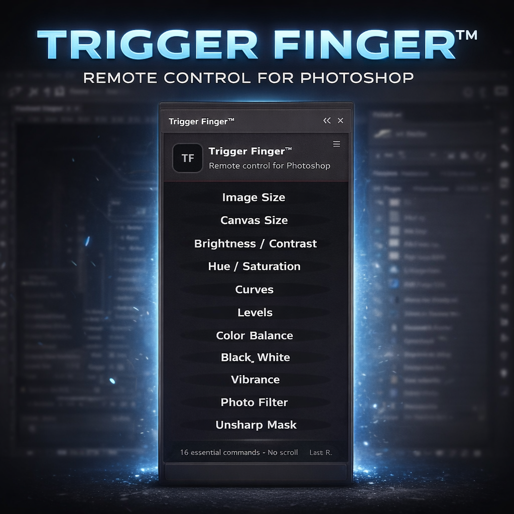 Trigger Finger™ is a lightweight Photoshop plugin that puts your most common commands, adjustments, and actions into a single, always-ready panel — so you stop hunting through menus and start moving faster.